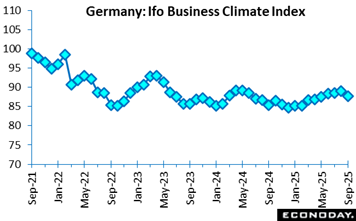 Germany’s September 2025 total Ifo business environment index dropped to 87 7, well listed below both the agreement (89 1 and the previous month’s 89.0. This sharp autumn signals that optimism is sliding faster than prepared for, with companies noticing headwinds rather than recovery.